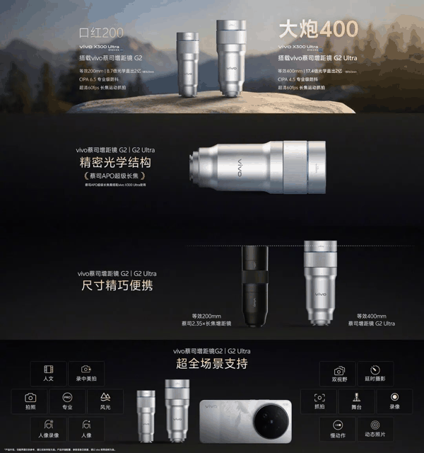 此外,新机还推出两款蔡司增距镜配件:等效200mm的增距镜G2,支持8.7倍光学直出2亿像素,叠加85mm镜头防抖可实现CIPA 6.5级防抖;等效400mm的增距镜G2 Ultra,采用2组15片精密光学结构,配备5片超低色散玻璃和1片玻璃非球面镜片,支持超快追焦与超稳防抖。