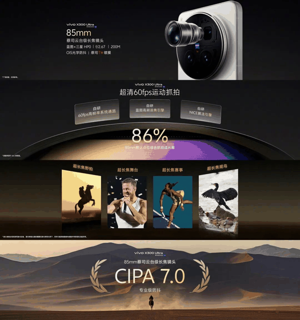 2亿像素85mm蔡司云台级长焦镜头,作为行业首个大底云台级防抖潜望镜头,全球首发蓝图×三星HP0传感器,支持3°OIS光学防抖(CIPA 7.0级),每秒最高可实现60次自动对焦,轻松应对远摄场景。