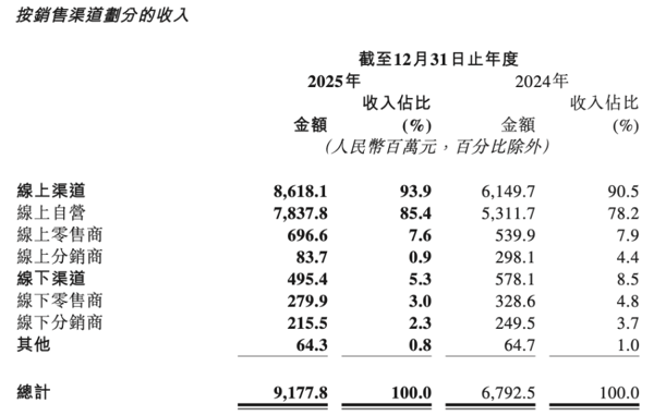 尤其是线上自营渠道(包括抖音、天猫等品牌自营店铺),2025年实现收入78.38亿元,同比增长47.6%,占公司同期全年收入的85.4%(去年占比78.2%)。