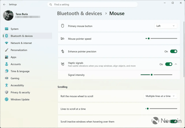不过,如果你正好有 MX Master 4,又安装了最新 Dev 版本的 Win11 系统,又恰好借助 ViVeTool 工具启用了触控功能,设置应用中便会出现对应开关和强度滑块。