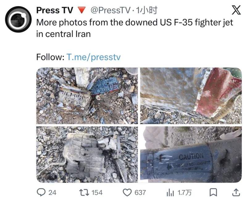 声明说,该战斗机已被“完全摧毁并坠落”,战机已解体,飞行员下落不明。声明还说,这是伊斯兰革命卫队防空系统过去12小时内击落的第二架美国战机。 伊朗媒体在社交媒体上发布被击落战机的残骸照片贴文截图。