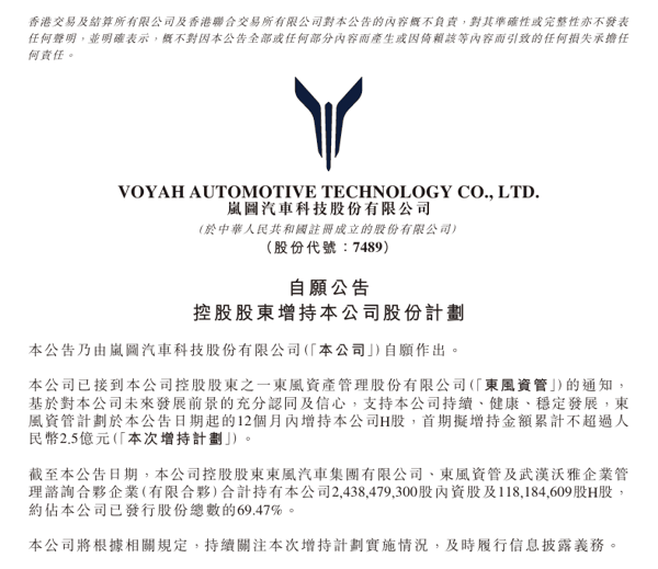 IT之家 3 月 30 日消息,岚图汽车今晚发布公告,称公司已接到公司控股股东之一东风资产管理股份有限公司(东风资管)的通知,东风资管计划于本公告日期起的 12 个月内增持公司 H 股, 首期拟增持金额累计不超过人民币 2.5 亿元 。