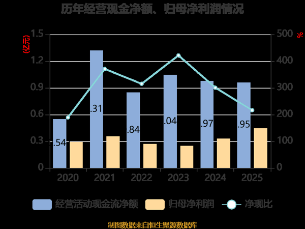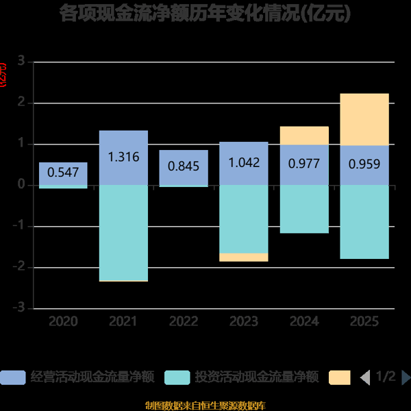 截至2025年,公司经营活动现金流净额为9587.37万元,同比下降1.91%;筹资活动现金流净额1.26亿元,同比增加8224.04万元;投资活动现金流净额-1.79亿元,上年同期为-1.17亿元。