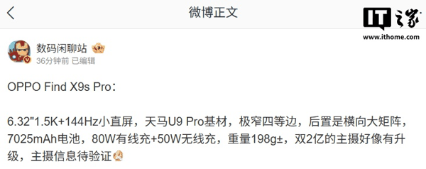 IT之家 4 月 3 日消息,OPPO Find X9s Pro 手机将于 4 月 21 日晚 19:00 发布,博主 @数码闲聊站 今日曝光了这款新机的部分规格: