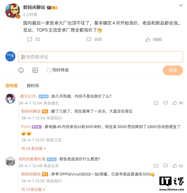 IT之家 4 月 1 日消息, 博主 @数码闲聊站 发文 ,称国内最后一家安卓大厂也顶不住了,基本确定 4 月开始涨价,老品和新品都会涨。至此,TOP5 主流安卓厂商全都涨价。