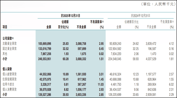 信用卡业务的溃败,只是零售信贷风险暴露的冰山一角。截至2025年末,该行个人贷款不良率从2.29%上升至2.85%,其中个人消费贷不良率2.93%,同比上升0.62个百分点,个人经营贷不良率3.51%,同比上升0.94个百分点。