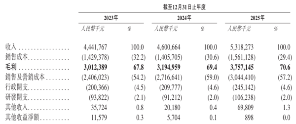 2023年至2025年,自然堂的营收从44.41亿元增长至53.18亿元,三年复合增长率约为9.43%;同步,公司的毛利由30.12亿元提升至37.57亿元,复合增长率11.67%;毛利率也从67.80%稳步增至70.65%。
