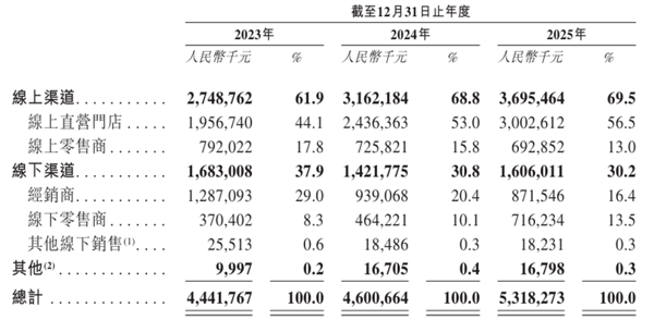 最近几年,自然堂的线上渠道占比逐步上升。从2023年的61.9%提升至2025年的69.5%,其中线上直营门店成为绝对主力,占比由44.1%增至56.5%;而线上零售商(如分销平台)份额则从17.8%压缩至13.0%。