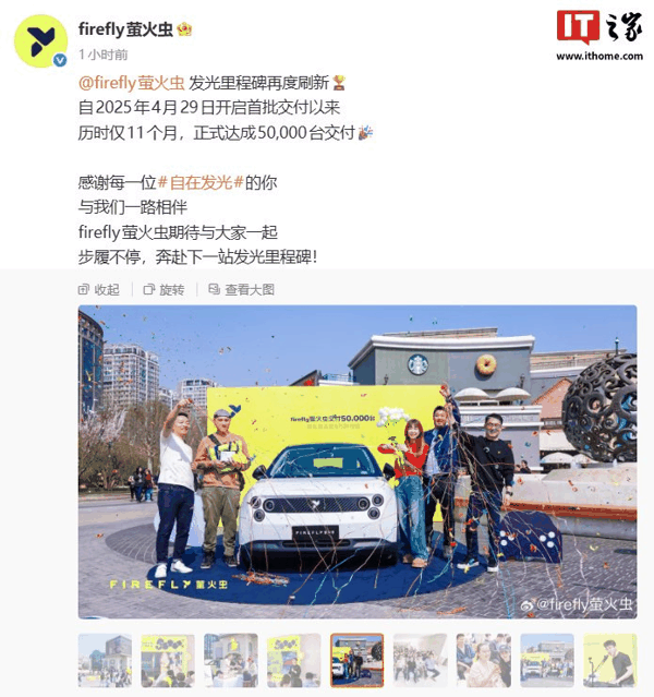 IT之家 3 月 29 日消息,蔚来 firefly 萤火虫品牌官方微博今日宣布里程碑再度刷新:自 2025 年 4 月 29 日开启首批交付以来, 历时 11 个月,正式达成 5 万台交付 。