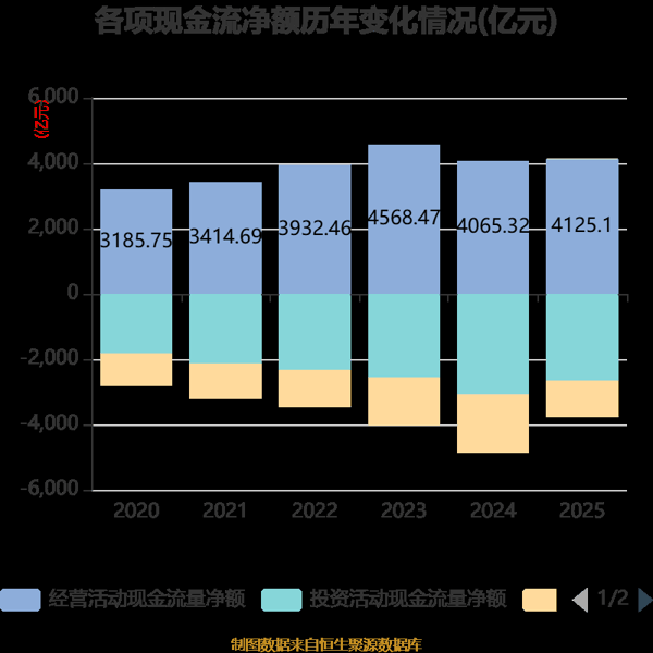 截至2025年,公司经营活动现金流净额为4125.1亿元,同比增长1.47%;筹资活动现金流净额-1113.35亿元,同比增加675.41亿元;投资活动现金流净额-2657.05亿元,上年同期为-3073.47亿元。
