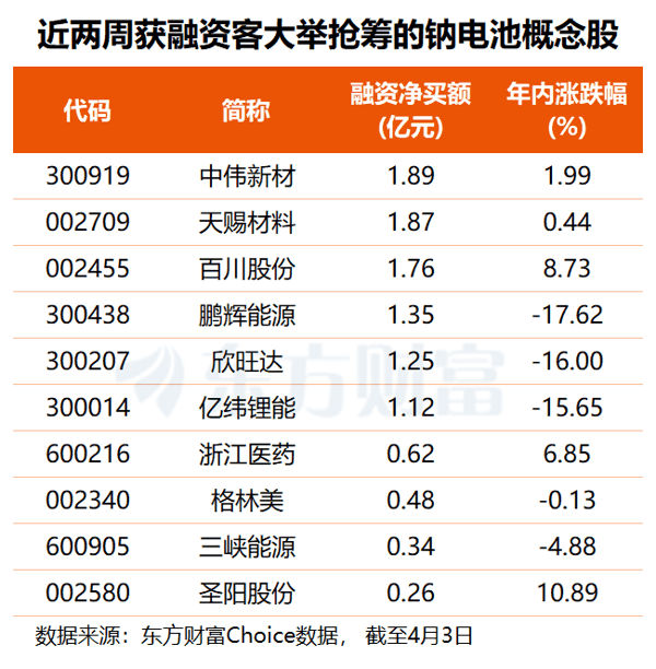 资金方面, 东方财富 Choice数据显示,近两周共有15只钠电池概念股获得千万元以上融资净买入,其中, 中伟新材 、 天赐材料 分别获杠杆资金加仓1.89亿和1.87亿元, 百川股份 也获融资客抢筹1.76亿元, 鹏辉能源 、 欣旺达 、 亿纬锂能 融资净买额均在1.12亿至1.35亿元之间。