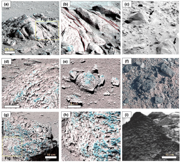 祝融号拍摄石块(a、d、g、b、e、h)与其他火星车(c、i)和地球(f)石块纹理对比。空间中心供图