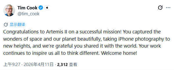 苹果CEO蒂姆・库克发文,祝贺NASA阿耳忒弥斯2号载人绕月任务圆满成功。
