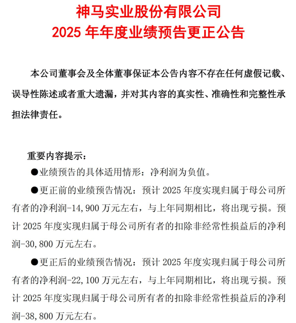 就在前一日(4月1日)晚间, 神马股份 (SH600810,股价8.21元,市值91.24亿元)也发布《2025年年度业绩预告更正公告》,将2025年的预计净亏损从1.49亿元扩大至2.21亿元,二者相差7200万元。