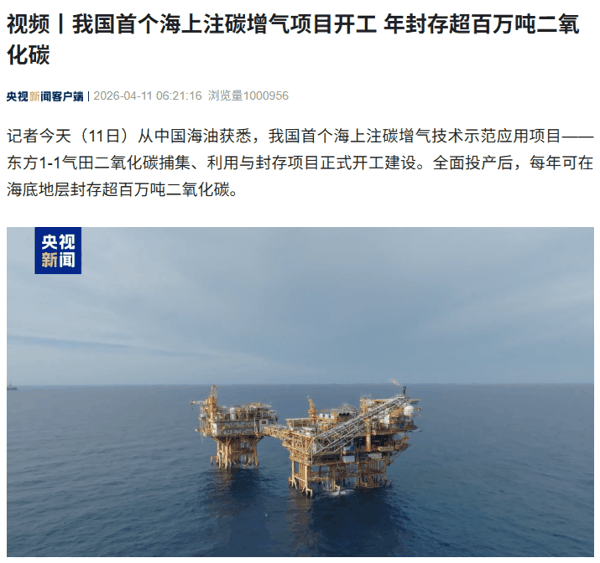 我国首个海上注碳增气项目开工,年封存超百万吨二氧化碳