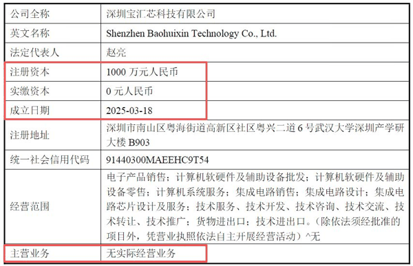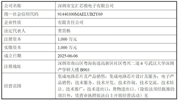 宝汇芯微成立时间不足一年。宝汇芯微成立于2025年6月6日,由深圳蜜连与深圳宝汇芯科技有限公司(以下简称宝汇芯科技)共同出资设立。其中,深圳蜜连以货币方式出资人民币510万元,占注册资本的51%;宝汇芯科技以货币方式出资人民币490万元,占注册资本的49%。