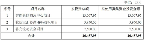 2026年3月31日晚间,好上好发布了定增预案。该预案显示,公司本次向特定对象发行A股股票拟募集资金总额不超过2.65亿元,扣除发行费用后,募集资金拟投资于以下三个项目:1)“智能仓储 物流 中心项目”,拟投资总额约1.3亿元;2)“收购宝汇芯微49%股权项目”,拟投资总额约5950万元;3)“补充流动资金项目”,拟投资总额7500万元。