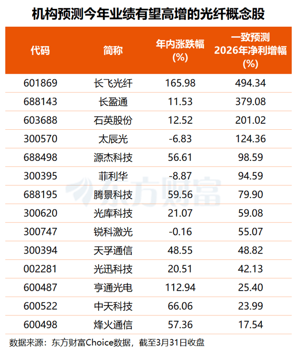 增长潜力方面,根据3家及以上机构一致预测,共11只光纤概念股今年业绩有望显著增长。其中,长飞光纤今年净利或同比大增近5倍, 长盈通 、 石英股份 、 太辰光 预测净利增幅分别达3.8倍、2倍和1.2倍, 源杰科技 、 菲利华 也有望实现九成以上净利增长。