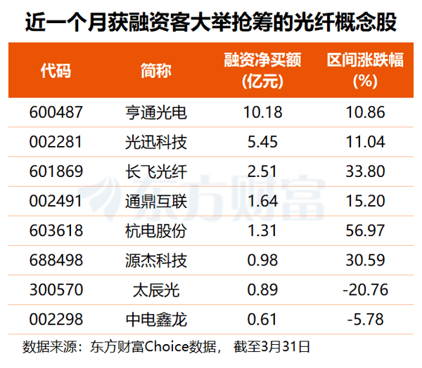 从资金角度看, 东方财富 Choice数据显示,近一个月共有11只光纤概念股获得融资净买入, 亨通光电 获杠杆资金大幅加仓10.18亿元, 光迅科技 、 长飞光纤 分别获融资客抢筹5.45亿和2.51亿元, 通鼎互联 、 杭电股份 、 源杰科技 、 太辰光 融资净买额均在0.88亿至1.65亿元之间。