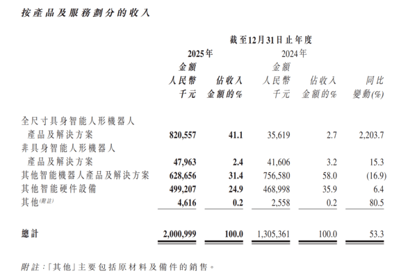 随着各行业对具身智能人形 机器人 的需求激增, 优必选 在本次年报中对产品业务结构进行了重新分类。具体来看, 全尺寸具身智能人形 机器人 (非遥控非玩具,身高160cm以上)收入同比增长22倍,达8.21亿元,销量1079台。 总营收占比达到41.1%,成为优必选第一大收入来源。