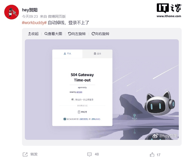 IT之家查询发现,部分网友晒图显示,腾讯云版龙虾 WorkBuddy 今日上午出现 504 服务错误,具体表现为无法登录、登录后闪退、加载失败等。