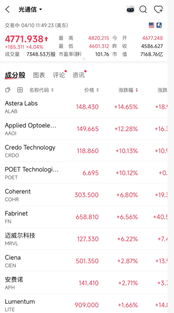 个股方面,美股光 通信 概念涨幅持续扩大,Astera Labs大涨超14%,AAOI涨超12%,Credo Technology涨超10%,Coherent涨超6%。