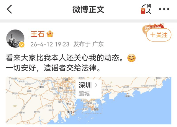 对此,王石、田朴珺均发消息进行回应。王石称:“看来大家比我本人还关心我的动态。一切安好,造谣者交给法律。”