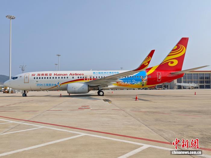 当日,在三亚凤凰国际机场停机坪上,一架身披三亚亚沙会主题彩绘的“亚沙号”飞机静静停驻,格外引人注目。机身以蓝、金、白三色为主调,海浪、沙滩、椰林与三亚亚沙会吉祥物交相辉映,整体设计动感明快,与三亚的热带滨海风情高度契合。