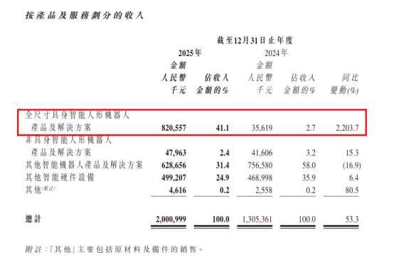 其中,身高160cm以上全尺寸具身智能人形机器人收入达8.2亿元,同比增长2203.7%;推动公司全年营收增至20.01亿元,同比增长53.3%。