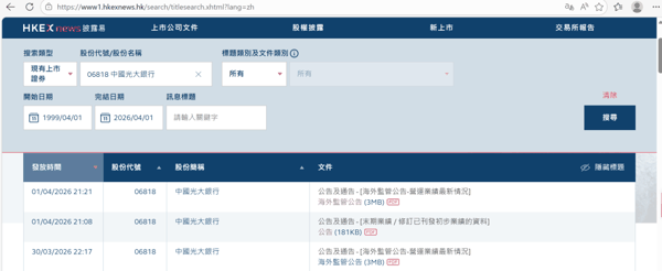 经记者核对,光大银行4月1日晚间在港交所发布的修订公告,将上述分行的资产规模数据均修订为光大银行A股2025年年报中的相应数据。