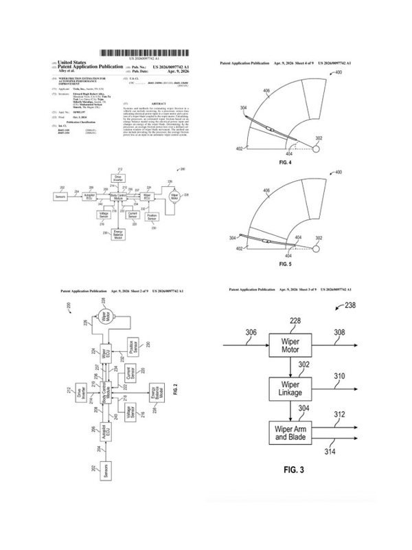 全新专利采用截然不同的技术路径:车辆电脑持续监测雨刮电机的供电功率,扣除电机内部摩擦、连杆阻力、空气阻力等可预估损耗后,剩余数值即为雨刮胶条与挡风玻璃间的摩擦力。