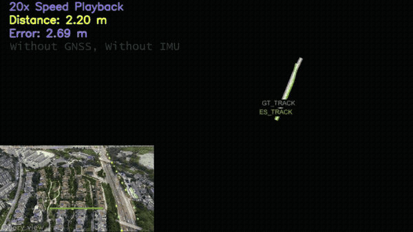 PiLoT 在10km飞行轨迹中的实时无漂移表现。画面主视图展示了无人机在基于实景三维模型构建的数字孪生场景中的飞行轨迹,PiLoT系统解算的实时轨迹(ES_TRACK,绿色光带)与RTK记录的真值航迹(GT_TRACK,粉色光带)高度重合,直观呈现了系统在复杂地理环境下的航迹定位效果。左下角小窗口“Query view”为无人机捕获的实时视频流,“Render view”则是系统根据当前位姿估计值从三维地图中同步渲染生成的地理参考视图,记录了从傍晚到入夜的剧烈光照变化过程。在长达13分钟、航程超过10公里的飞行测试中,PiLoT维持了1.374米的均值定位误差,并保持25~30 FPS的实时推理速度。