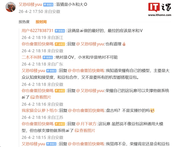 有网友猜测博主所指的两个大厂是“h”和“O”,但随后有其他网友否认了该说法,表示“h”有自己研发的大模型所以不可能。同时他认为“H”和“M”也不太可能, 所以应该是剩下的厂商在洽谈 (IT之家注:H 预计指华为、h 预计指荣耀、M 预计指小米、O 预计指 OPPO、V 预计指 vivo)。