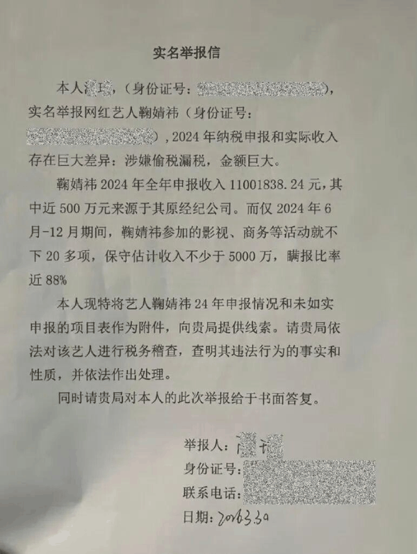 3月31日上午,三封实名检举税收违法行为的函件在社交平台登上热搜,演员鞠婧祎被实名举报偷税漏税,其收入明细被曝光,半年收入估算不少于5000万元,瞒报比率达88%。对此,国家税务总局上海市税务局稽查局开出了“接收回执”。