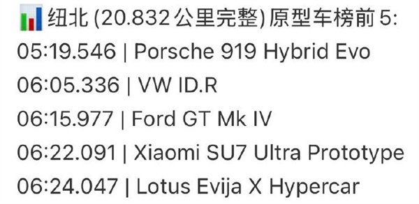 目前纽北官方圈速榜单中, 保时捷919Evo以5分19秒546稳居榜首,大众ID.R以6分05秒336位列第二,福特GT Mk IV紧随其后排名第三,比此前创下6分22秒091圈速的小米SU7 Ultra原型车快了超6秒,也让小米车型的排名随之降至第四位。