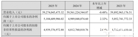 双汇发展发布的2025年年报显示,报告期内,公司实现营业收入592.74亿元,同比微降0.48%,这点降幅几乎微不足道,而归母净利润却同比增长2.32%至51.05亿元。
