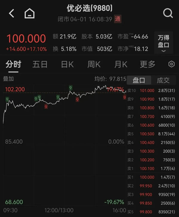 Wind数据显示,受此利好消息影响,4月1日,优必选股价收涨17.1%,报100港元/股,最新市值为503亿港元。