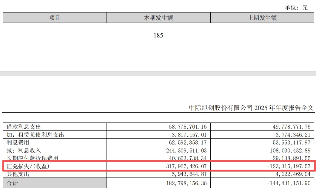 2025年,中际旭创的财务费用出现明显变化。全年财务费用为1.83亿元,而上年同期为-1.44亿元。公司解释称,主要原因是汇兑损失增加。具体来看,2025年汇兑损失为3.18亿元,而2024年同期为汇兑收益1.23亿元。这一进一出,相差4.41亿元。