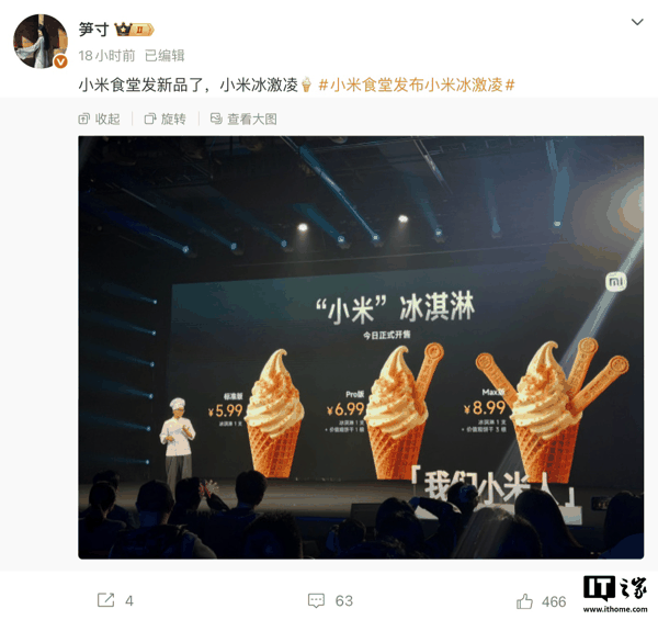员工晒小米食堂新品“小米冰淇淋”:提供标准/Pro/Max三种版本、仅对内部销售