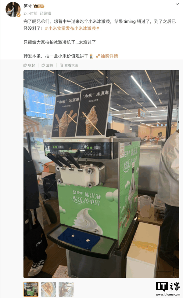 IT之家注意到,后续“笋寸”还发文称小米冰淇淋卖完了,参考其照片,可以看到冰淇淋机上印有“蒙牛”标识。