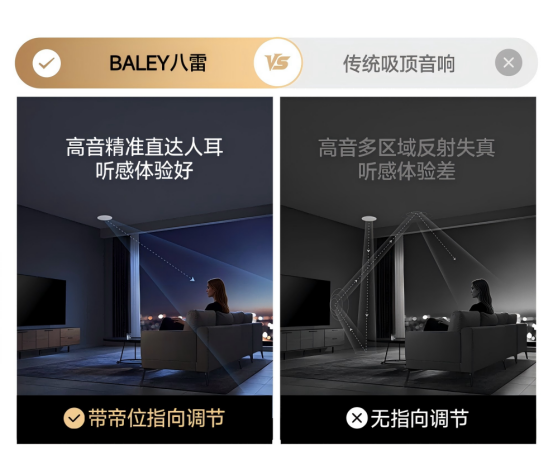 传统吸顶音响的高音头固定朝下,声音只能垂直向下传播,飞机永远像是在"头顶上方",缺乏空间移动感;而BALEY八雷指向调节技术可将高音单元精准指向听音位,配合调试角度,让声音具有真实的空间定位和移动轨迹,真正实现"飞机从头顶飞过"的沉浸式观影体验。
