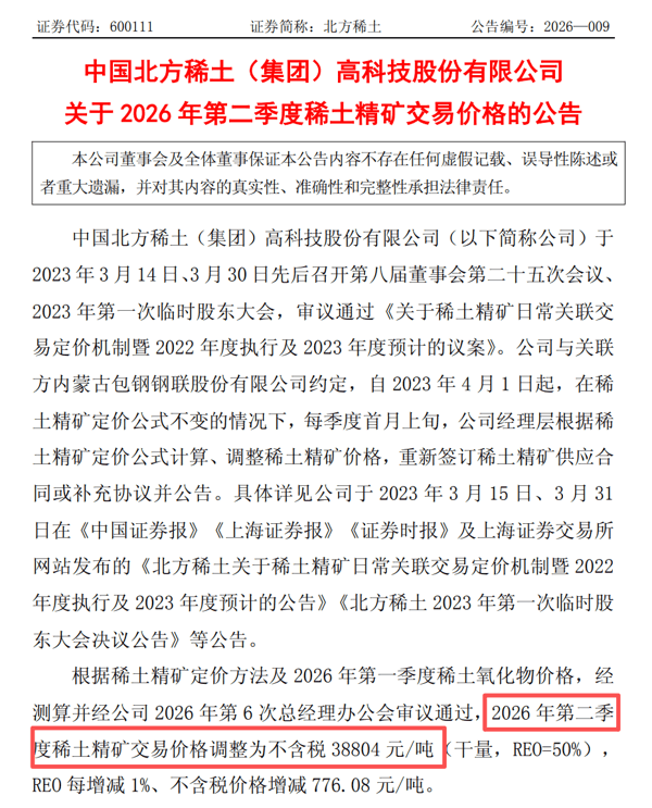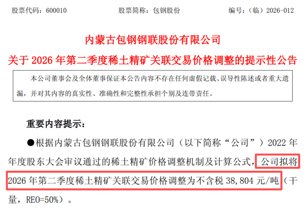 同期, 包钢股份 亦公告称,拟将2026年第二季度稀土精矿关联交易价格调整为不含税38804元/吨。