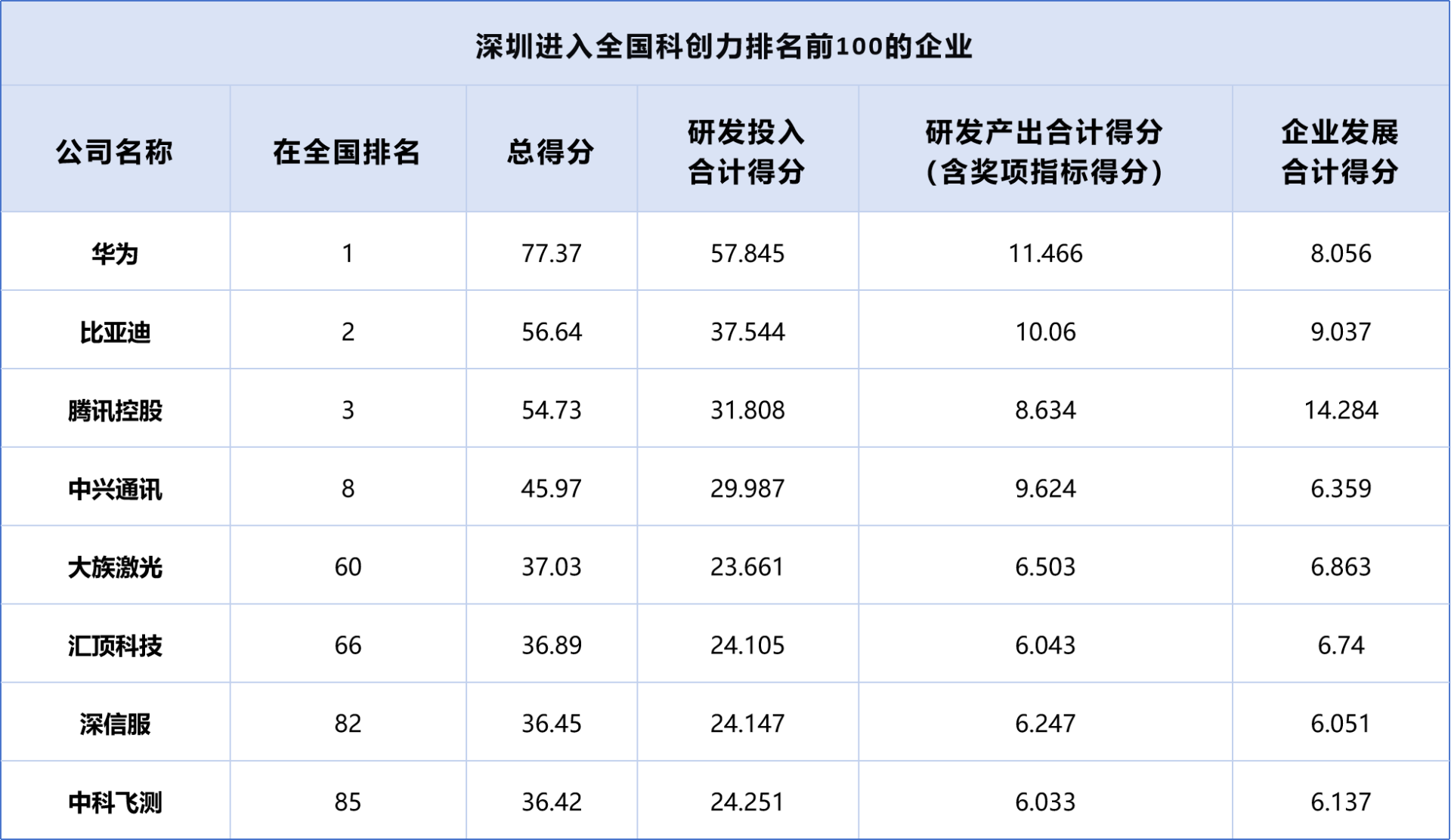 在中国企业科创力整体排名中,前三名(华为、比亚迪、腾讯)均被深圳包揽,它们来自通信传输设备业、汽车制造业以及信息传输、软件和信息技术服务业。