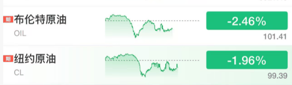 受此影响,油价出现回落。西德州中质原油(WTI) 期货 下跌约2%,布伦特原油 期货 下跌超2%,至每桶101美元上方。