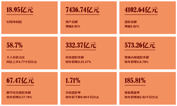 2025年,郑州银行资产规模稳步上升,报告期末资产总额达到7436.74亿元,较年初增长673.09亿元,增幅9.95%;发放贷款及垫款总额4102.64亿元,增幅5.82%;存款总额4630.75亿元,增幅14.47%。