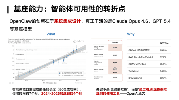 来看一组统计数据,这是大模型出现以来, 智能体在 50% 成功率的情况下,它可以自主完成任务的长度 ,大模型出来之后,倍增时间约 7 个月,过去一两年的倍增时间加速到约 4 个月。右边的图是我刚才提到的 Claude Opus4.6、GPT-5.4,基本上都是在代码能力、工具调用能力方面相比于前一版本有了质的飞跃。