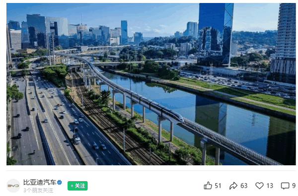 IT之家 4 月 1 日消息,比亚迪今日宣布,其首个海外轨道交通项目 —— 巴西圣保罗 17 号黄金线云轨于当地时间 3 月 31 日正式通车运营。