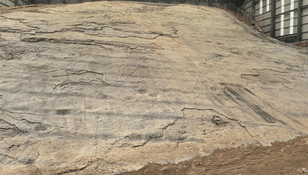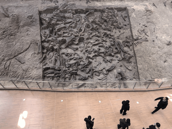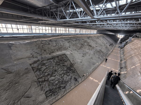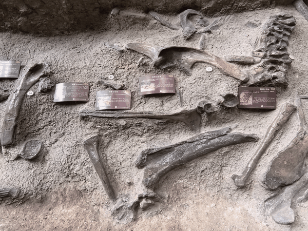“这些化石不是零散分布的,而是见证了一场远古的‘集群灾难’。”讲解员的话语勾起了我们深入考察的好奇,结合现场地质剖面与专家研究成果,这场史前灾难的全貌逐渐清晰。经古脊椎所的同事研究证实,晚白垩世晚期,诸城地区气候发生突变,加之地质活动活跃,突发大规模泥石流或洪水灾害,大量恐龙在迁徙、觅食或饮水途中,被突如其来的泥沙迅速掩埋。由于掩埋速度极快,恐龙的遗体来不及被破坏,便完整保存下来,经过亿万年的压实、石化等地质作用,最终形成了如今规模宏大的化石长廊。而后期的地壳抬升与板块运动,让原本水平埋藏的化石层发生倾斜,形成了独特的 45 °斜坡景观,这种大规模、高集中度、保存完好的恐龙化石群,在全球范围内都极为罕见,是研究恐龙集群死亡原因、古气候突变、地质运动的天然实验室。