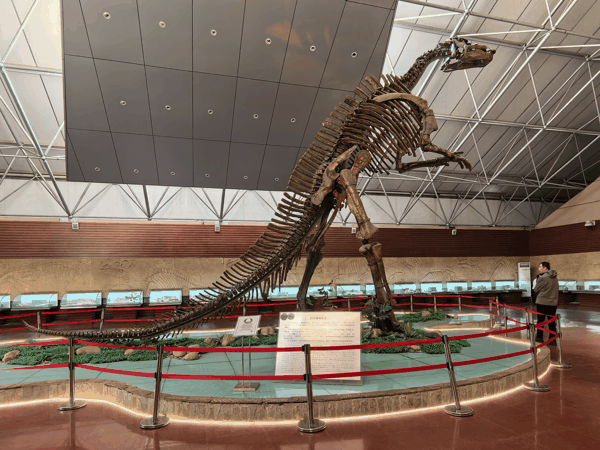 沿着蜿蜒的展廊前行,首先抵达的是巨大诸城龙展厅——这里是整个博物馆的核心,更是本次考察的首个重点研究对象。当那具庞然大物的轮廓逐渐清晰,闯入视野的瞬间,不由自主地让人屏住了呼吸,即便早已通过学术资料了解其规模,亲眼所见的震撼依旧难以言表。“巨大诸城龙”高 9.1 米,长 16.6 米,骨架完整度超 85% ,是一种非常高大的鸭嘴龙,也是诸城恐龙最具代表性的名片。
