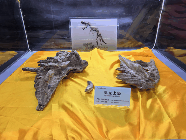 馆内的核心展品无疑是巨型诸城暴龙化石,这是白垩纪晚期亚洲大陆上当之无愧的“末代暴君”,体长约 11 米,站立高度约 4 米,体重约 6 吨,拥有锋利的牙齿与强劲的下颚,咬合力极强,是当时顶级的掠食者,主要以鸭嘴龙、角龙等植食性恐龙为食。 2025 年,这里还发现了长 1.21 米的暴龙股骨化石,刷新了亚洲暴龙类股骨长度纪录,进一步证实了诸城暴龙的庞大体型与强悍实力。此外,馆内还收藏了世界唯一大型带羽毛暴龙——华丽羽王龙化石骨架,这一发现颠覆了人们对暴龙体表无羽毛的传统认知,为研究恐龙向鸟类演化提供了重要线索。